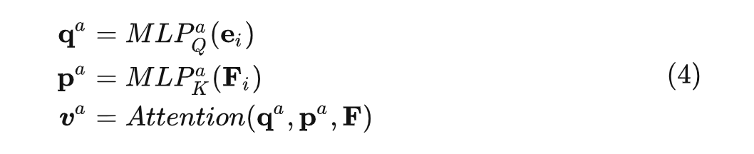 DAE 使用了 multi-head attention 的结构进行建模,以 item id 的 embedding 和特征投影向量作为 query 和 key,item 的原始特征作为 value 来进行多头注意力计算。特征投影以及注意力的计算参见公式 (4):