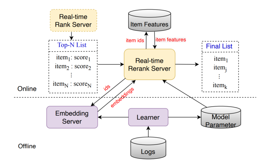 整个 FDSB 框架应用于重排阶段,在线输入是来自按精排打分作为初始排序的 Top-N 列表,根据输入列表以 item id 为 key 获取 item 的特征(包含 id embedding 和 side information 特征),之后的 real-time rerank server 分别顺序执行 DAE 模块获取特征的分离表征和自适应多元重排器贪心的或取最终的推荐列表;这里有个待确认的地方,