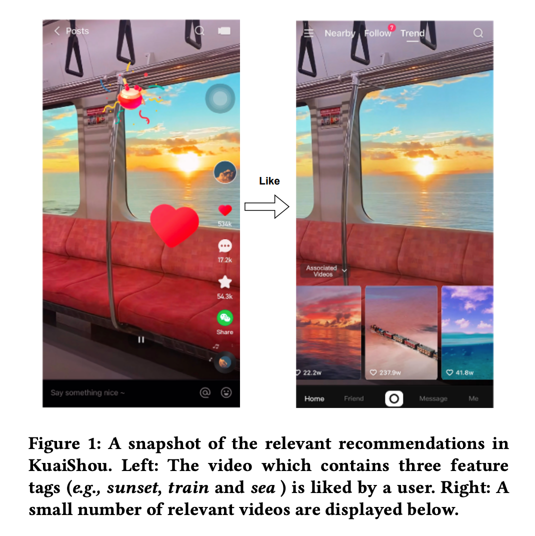 本文实际上就是研究如何去平衡“相关推荐”中的相关性及多样性。这里的“相关推荐”需要单独来解释一下,因为初读论文的时候确实这个词给我带来了一些困惑。论文里的”相关推荐“任务,我的理解是在推荐中增加了主动信息获取,从而对主推荐流中的推荐结果进行干预。例如:当用户看完一个短视频时,他往往会想要继续观看和这个短视频相关的拓展内容。