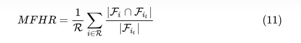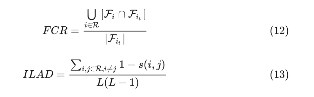 的特征集合。MFHR 通过计算特征的平均命中率来衡量两个 item 间的相关性。为了衡量推荐 item 集合的特征感知多样性,论文里又引入了两个衡量指标 FCR 和 ILAD: