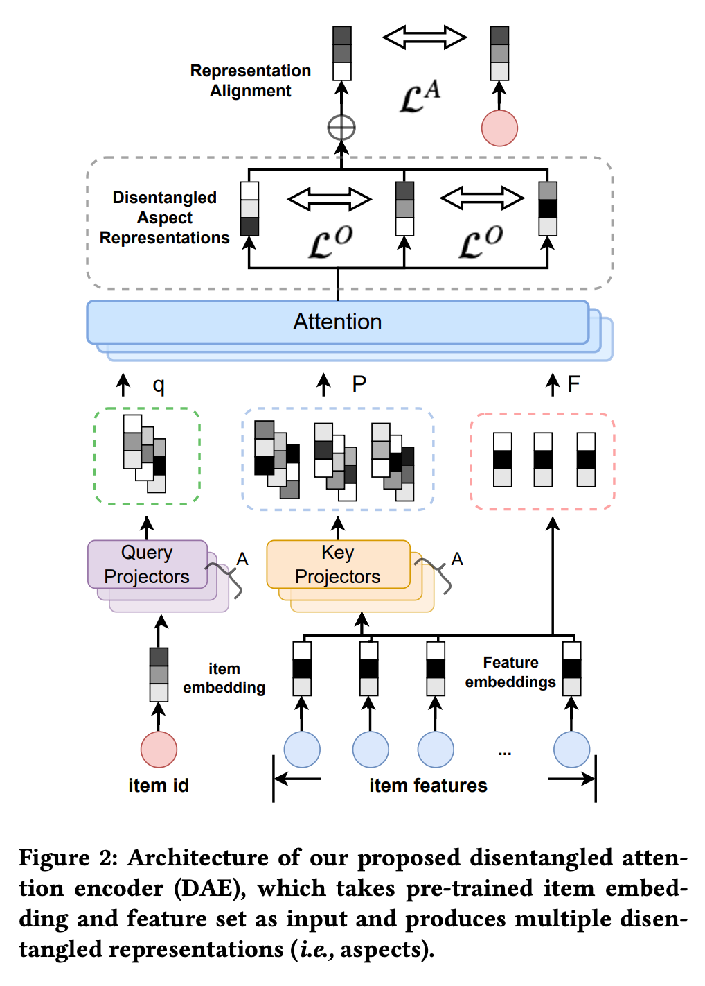 考虑到这个问题,论文中提出了一种解耦注意力编码器(DAE)来将这些特征进行解耦,学习 item 的分离表征