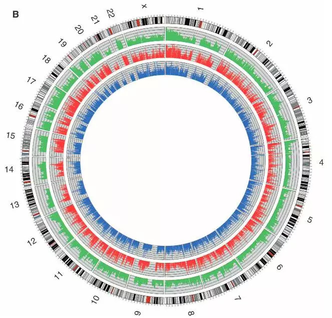 染色体示意图(外环)由pter-qter 顺时针排列(着丝粒为黄色)。其他(由外到内):GC 含量(绿;范围:30-55%),总测序深度(红;每 SNP 40-100 reads),胎儿特异性读取测序深度(蓝;每 SNP 1-8 reads)。 图片来自解螺旋网。