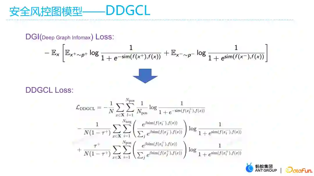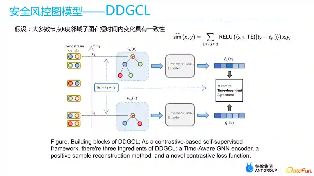 这主要是因为,风控场景的标签本身太少且来之不易(例如欺诈场景,其标签都来自于已有经济损失甚至心理、精神伤害的被欺诈受害者),即使通过一些半监督算法进行扩散也难以保证标签的丰富度和纯度。因而为了提高图模型的鲁棒性和泛化性能,我们参考其他领域的做法,将对比学习、自监督算法作为一种一致性损失加入到模型中,提出了动态图的对比学习模型DDGCL。