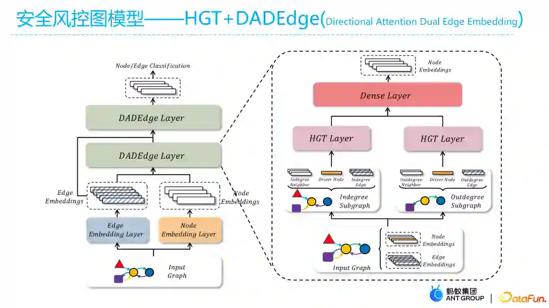 但是边作为一种属性并不能把边的方向有效地与其他信息结合,因此对HGT在场景上做一个适配,这种适配机制是观察分析了大量资金图后,根据资金流的特性而设计的,即HGT+DADEdge模型。HGT+DADEdge模型把针对一些有向非对称的动态图做一些方向上的升级,即在每个方向上的一类边单独做graph transformer处理。(中间负责处理的每一层为DADEdge layer),再把HGT嵌入到DADEdge layer里去,可以有效地把一些边方向与点边上拓扑结构进行一个信息整合。