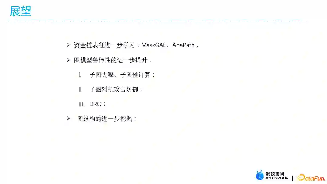 (1)风控场景的资金链拓扑结构进一步学习,模型包括MaskGAE和AdaPath。比如欺诈、赌博、洗钱资金转移的path还没有百分之百抓出来,因此依托高校合作,刚与中山大学陈亮老师一起提出maskGAE的工作,对已知的path或者高置信度的path黑产进行mask,通过用模型对mask进行预测,从而提高我们的path的捕捉能力;另外,跟浙江大学杨洋老师合作的AdaPath工作也在进行中,通过对抗生成的方式生成一些高置信度的path,然后补充到现有的训练集中,让模型捕捉到更多path信息。