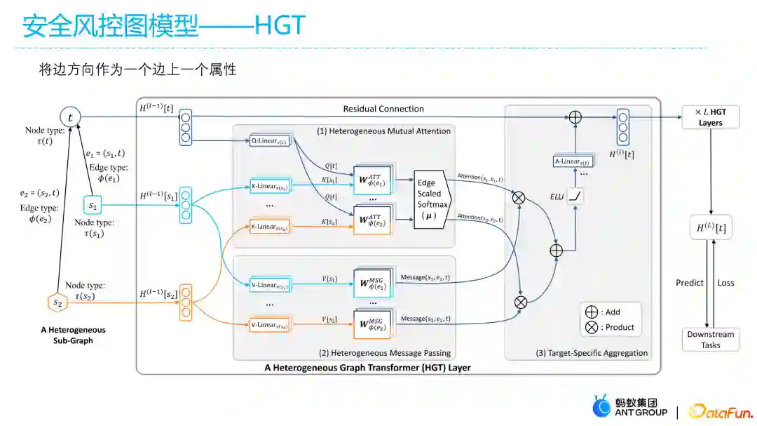 经过一系列的算法调研,考虑选择以HGT模型作为一个baseline的主模型网络,同时把边方向作为属性引入模型中,把边方向作一种模态单独attention操作。HGT的异质处理不是放在前面映射环节,而是将异质处理放在transformer的k、v、q映射函数里面进行操作,这样做的好处是attention时可以完全考虑每个模态分布等价性。