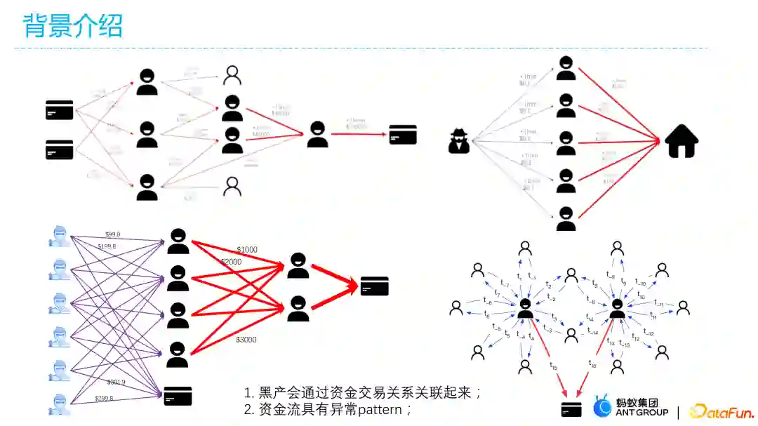 第一个例子为反洗钱,在反洗钱的上游有一些资金来源部门的一些卡或者账户,希望通过蚂蚁里面的一些资金转账的渠道把这些资金洗白,从而实现资金的流转套现,资金图上有个明显特征就是存在大量快进快出的资金流。