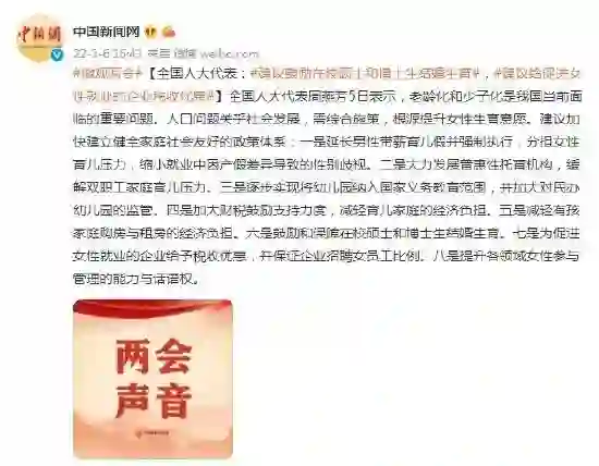 小募注意到,据中国新闻网消息,全国人大代表周燕芳3月5日表示,老龄化和少子化是我国当前面临的重要问题。人口问题关乎社会发展,需综合施策,根源提升女性生育意愿。建议加快建立健全家庭社会友好的政策体系。