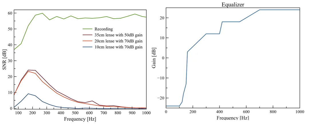 下图显示了从每个望远镜获得的光学测量结果,和从麦克风的声学测量结果中获得的SNR。根据获得的结果,研究人员还创建了一个均衡器(equalizer)。
