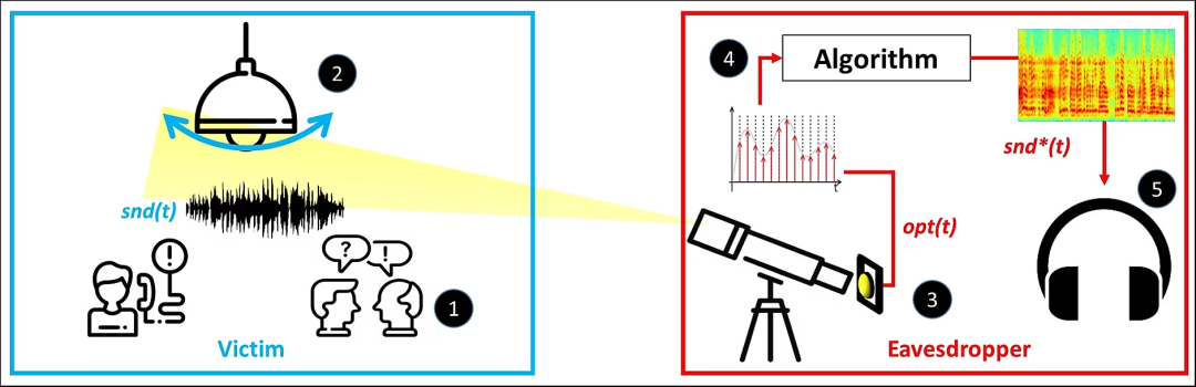 房间内的声音会在灯泡玻璃表面上产生微小振动,通过测量这些振动引起的灯泡输出光的微小变化,就能够清晰地获取声音,以辨别对话内容,甚至连音乐都能识别!