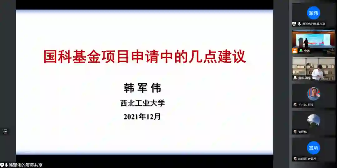 再接下来,西北工业大学韩军伟教授分享了国家自然科学基金项目申请中的几点建议。他认为科学基金对青椒来说至关重要,是青椒发展的第一桶金。而基金申请成败的关键在于选题,要抓住两个关键点:创新性和研究基础。选题要在熟悉的领域做擅长的事情。申请书写作要逻辑清晰,突出重点,一条主线贯穿始终。
