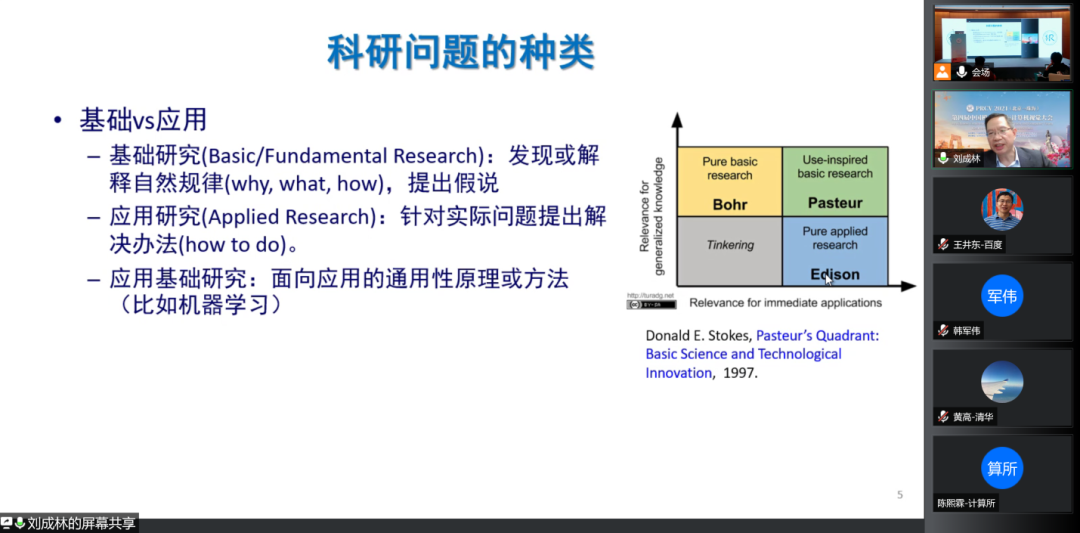 其次,中科院自动化所刘成林研究员分享了他对科研选题的看法,他认为科研问题分为以下几类:基础研究、应用研究、应用基础研究。人工智能领域的基础研究往往滞后于应用研究。他建议我们要做问题导向的研究,既有理论引领,又有实用价值,即“顶天立地”。要注意几个选题的误区,不要追求热点,也不要片面的追求理论或应用。要有独立的思考,独特的研究方向和路线,形成独特的影响。