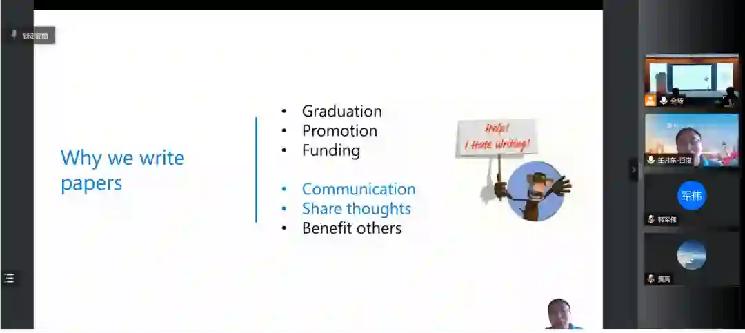 首先,百度公司首席架构师王井东博士分享了他对论文写作的看法,他认为我们应该从交流和分享的角度去写论文,注意6个方面的问题:Problem、Categorization of related works、Positioning、Approach、Experimental verification、Open-sourcing。建议大家要提前开始写作,而不是最后才写,一篇好的论文一定是反复改出来的,逻辑比语言更重要。