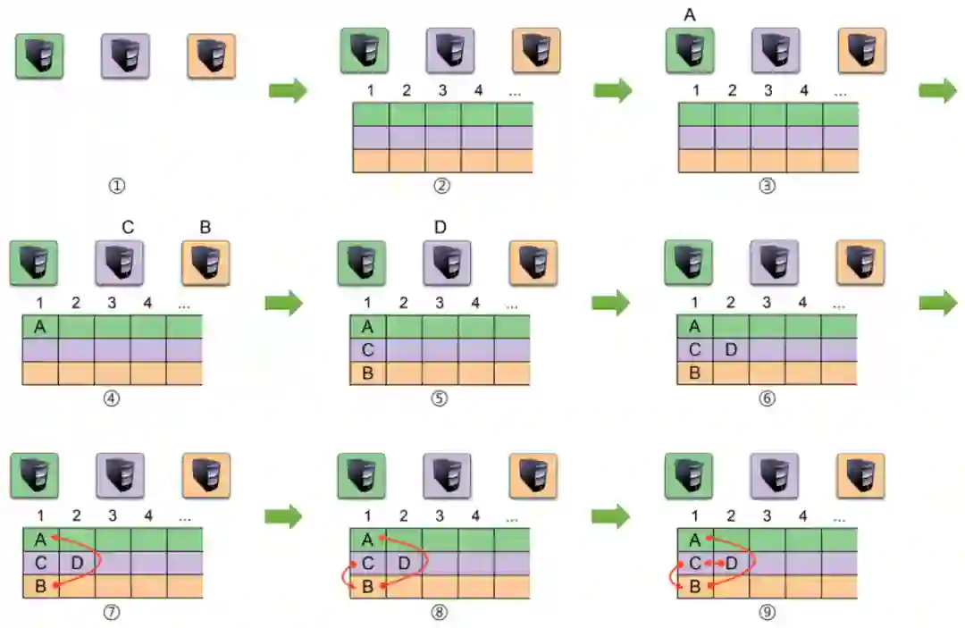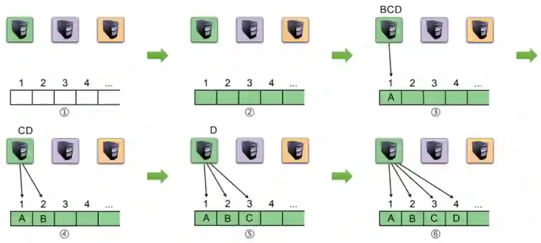 使用Multi-Paxos对一系列值达成一致的流程如图2所示。三个副本,以不同颜色标识,首先进行Leader选举,绿色副本被选为Leader,然后连续提议A、B、C、D四个值: