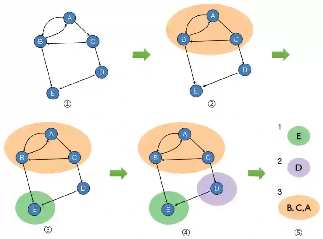 为了处理循环依赖,EPaxos对Instance重排序的算法需要先寻找图的强连通分量,环路都包含在了强连通分量中,所有强连通分量构成一个有向无环图(DAG),然后对强连通分量进行确定性的拓扑排序。