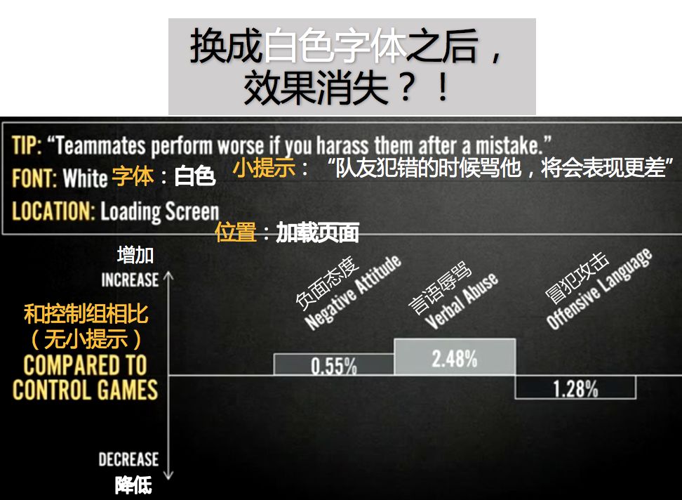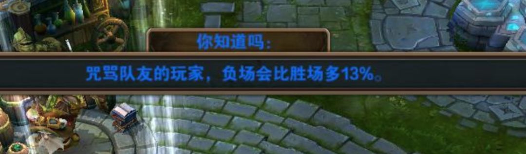 根据LOL的实验,对于同样一条在加载页面显示的小提示:“队友犯错的时候骂他,他们将会表现更差”。