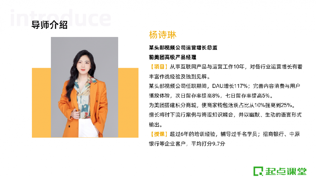 本次公开课由从事互联网产品与运营工作10年,对各行业运营增长有着丰富作战经验及独到见解的杨诗琳老师亲自授课。