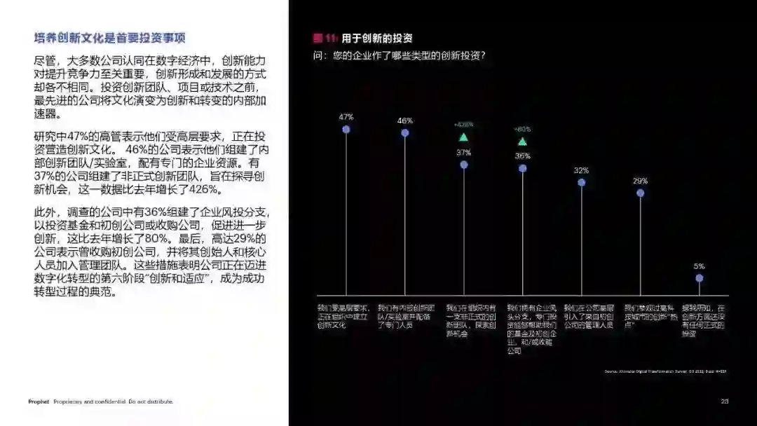 创新在企业内仍占据一席之地。近一半的受访者表示他们在营造创新文化,拥有内部创新团队正成为常态。