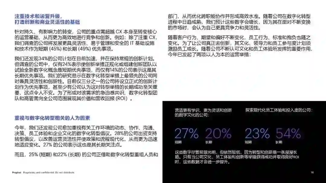 尽管大家逐渐意识到人为因素在数字化转型进程中所发挥的重要作用,例如:员工体验和企业文化,大多数转型举措仍继续着眼于客户接触点的现代化 (54%) 和基础设施的加强 (45%)。但许多企业却没有通过尽职调研以理解他们的客户,有 41% 的企业在没有进行全面客户调研的情况下,便对数字化转型作了投资。