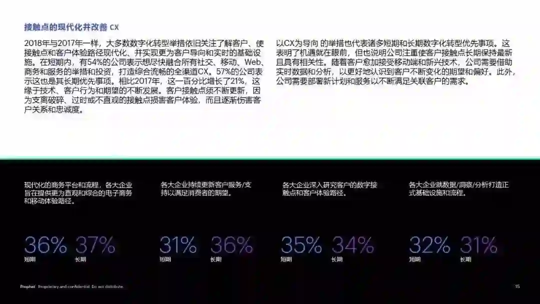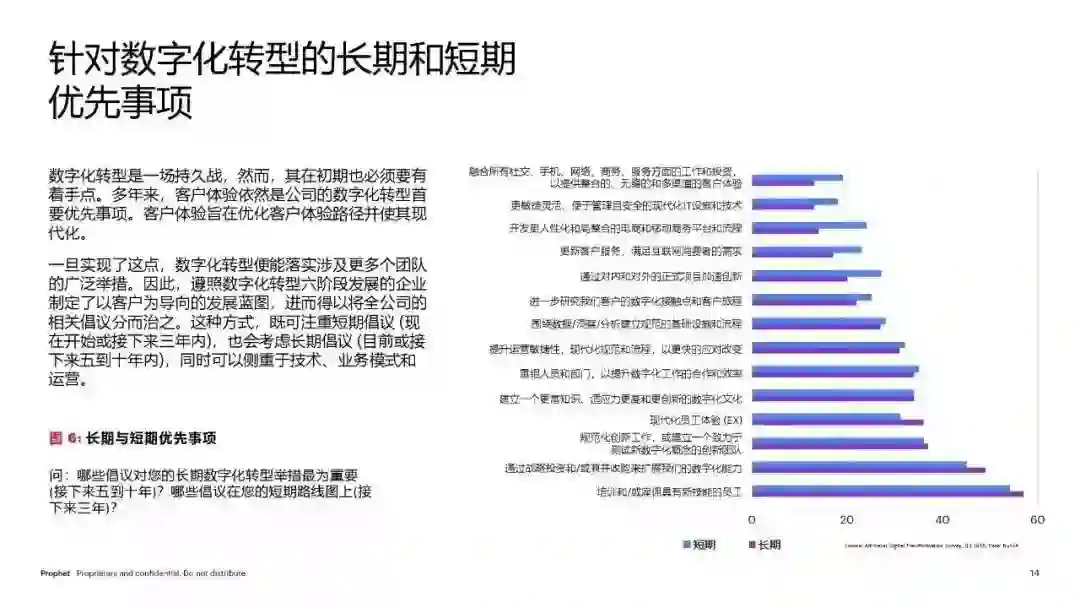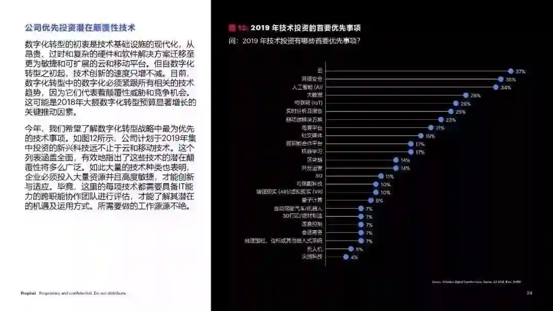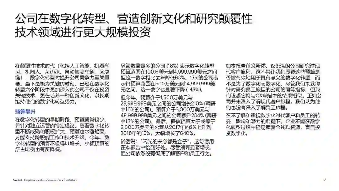 2019年,战略数字化转型的重要性已经不止于IT领域,而影响着全公司的竞争力。企业的相关预算直线攀升,利益相关方所关注的颠覆性技术数量急剧增加。数字化项目开始由首席高管主导,并由相互协作的跨职能团队管理。客户体验 (CX) 继续占据数字化转型投资的主要份额,但在2017年,我们注意到员工体验和企业文化在赋能和加速变革、增长和创新方面也愈发重要。