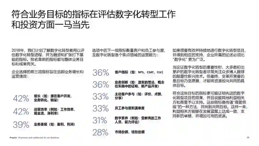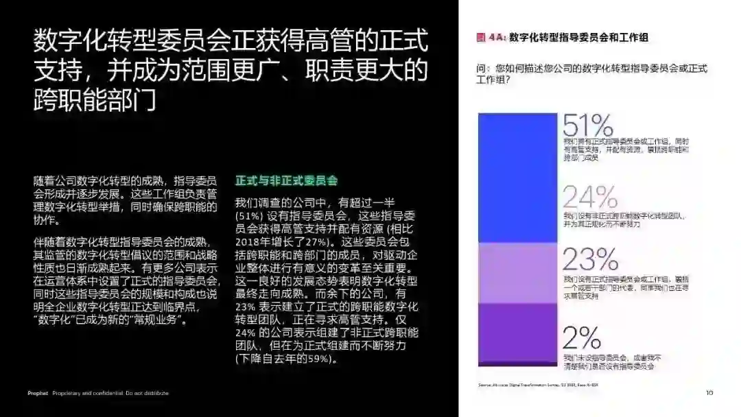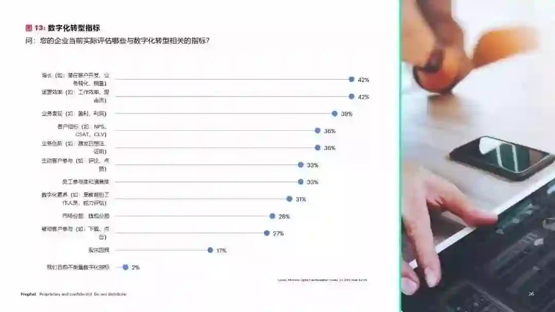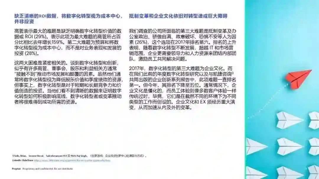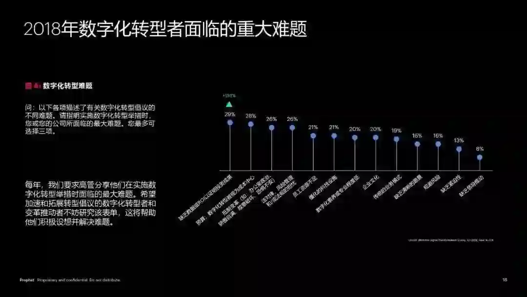 对于领导数字化转型工作的人员来说,获得企业支持依然是最大的挑战。在我们所研究的公司中,数字化转型通常被视为成本中心 (28%),ROI 也难以通过数据进行证明 (29%)。内部文化问题也是大难题,内部根深蒂固的观点、对于变革的抵制(26%) 及对法律和合规的忧虑 (26%) 都在妨碍着数字化转型的进程。