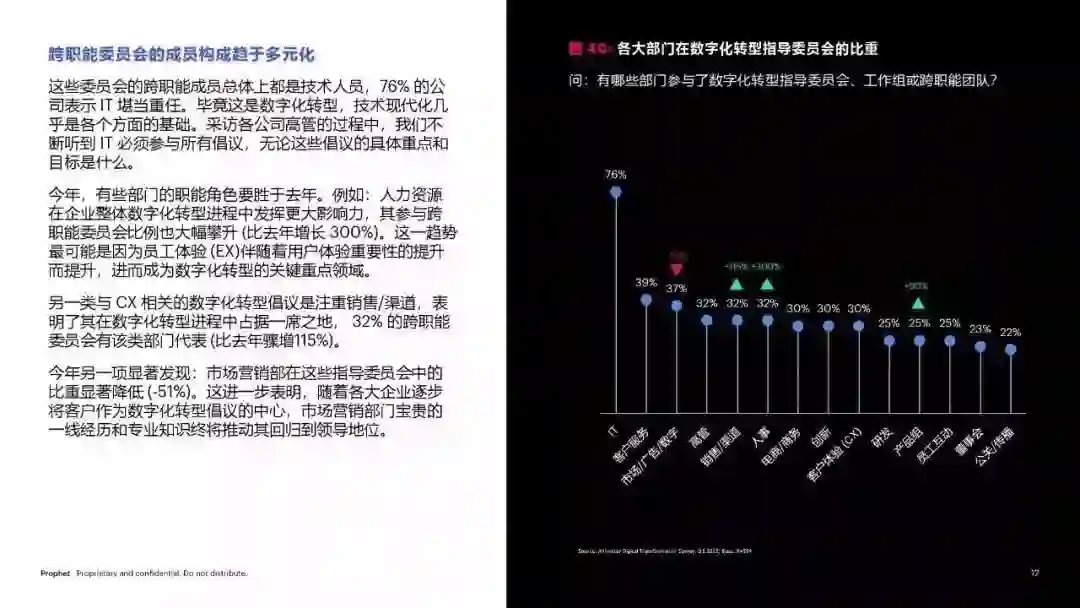 成功的数字化转型是全企业举措,领导者最好要有开阔的组织视野。首席信息官 (CIO) 连续第二年成为最常负责或支持数字化转型倡议 (28%) 的人物,而首席执行官 (CEO) 则日益发挥领导作用 (23%)。
