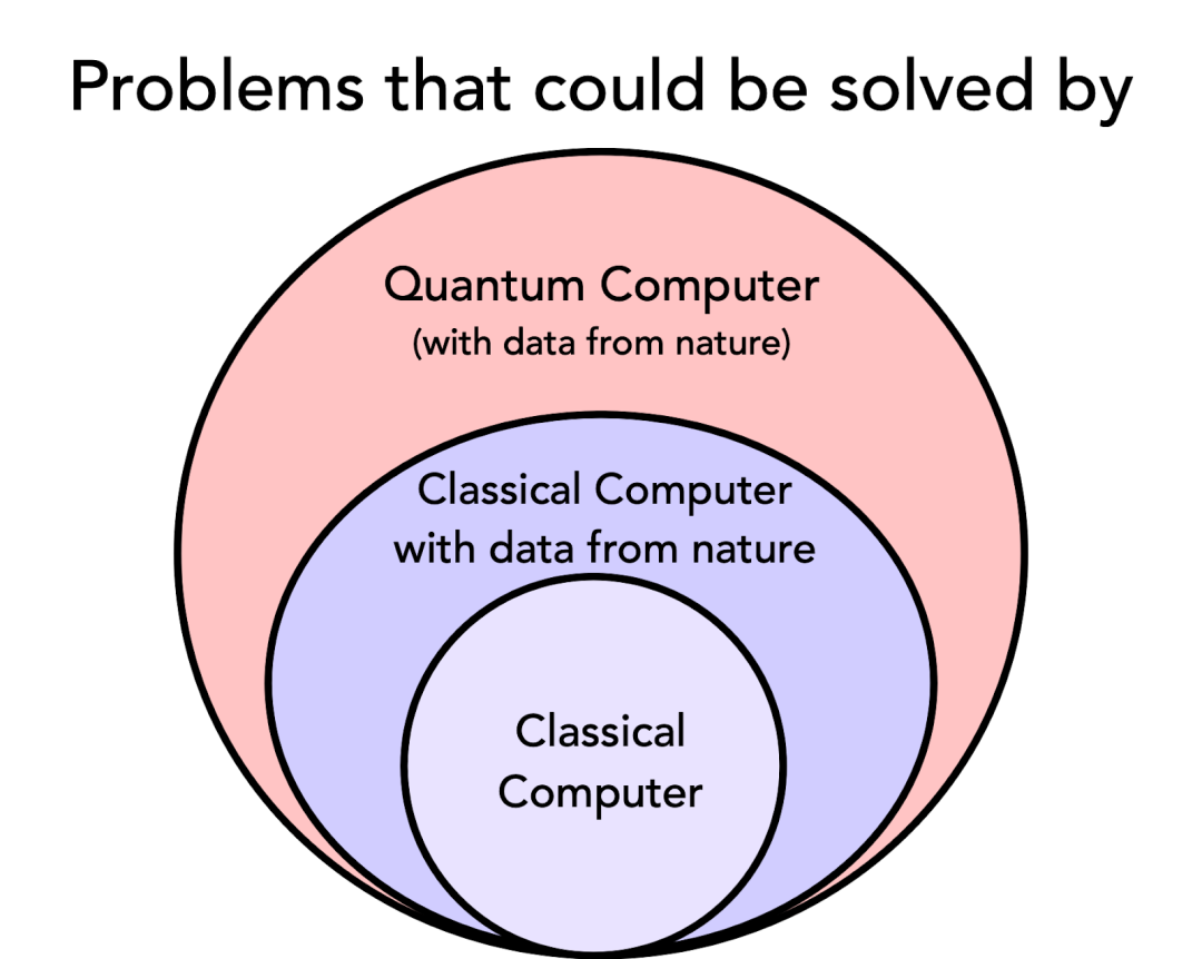 对于因没有数据而难以解决的一些问题,传统计算机通过从现实(例如物理实验)中收集数据并基于这些数据进行学习即可将其解决。但是,使用量子计算机则可以解决更广泛的问题。如果我们设想可以使用量子计算机来模拟现实,那么量子计算机采用从现实收集的数据就不具备更进一步的计算能力。