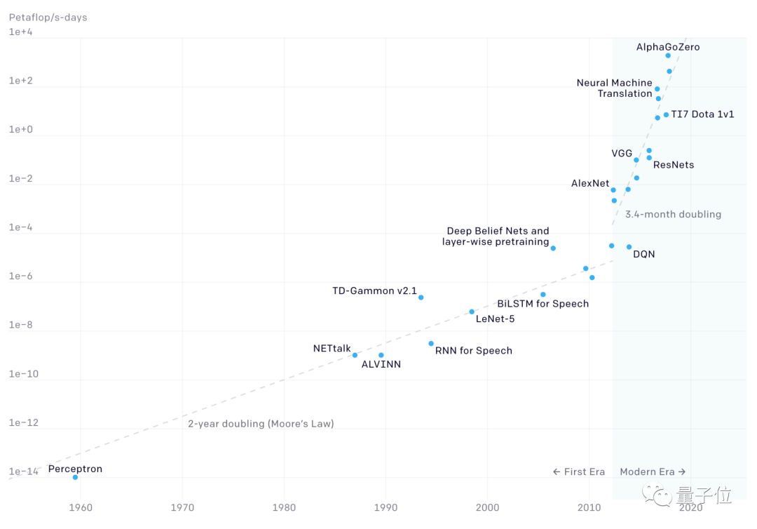 OpenAI还分析了更早期的数据,从第一个神经网络感知器(perceptron)诞生到2012年AI技术爆发前夕的状况。