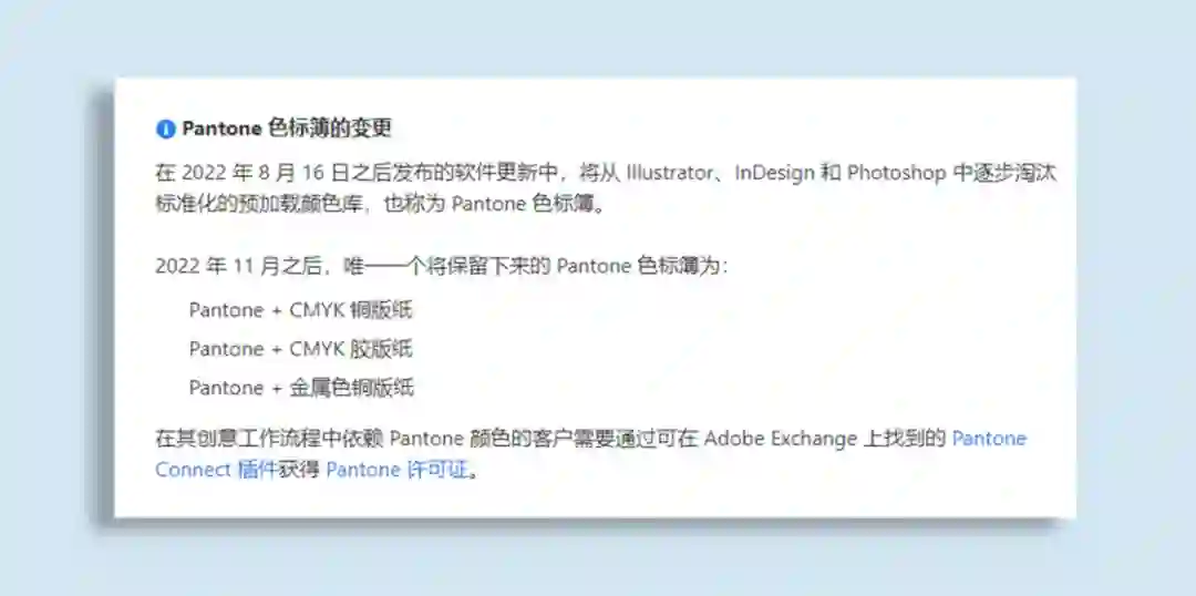 Adobe 在关于在 Illustrator 中使用 Pantone 颜色的书籍中答复道: 带有来自 Pantone 颜色书籍的色板的 Illustrator 文件将在打开或放置在 Illustrator 中时正常工作(包括过去或将来的软件版本)。 带有已放置链接的 Photoshop 文件的 Illustrator 文件,这些文件在 Illustrator 中的颜色不再可用时,使用专色通道渲染灰色 / 黑色。 来自 Adobe 官网 。