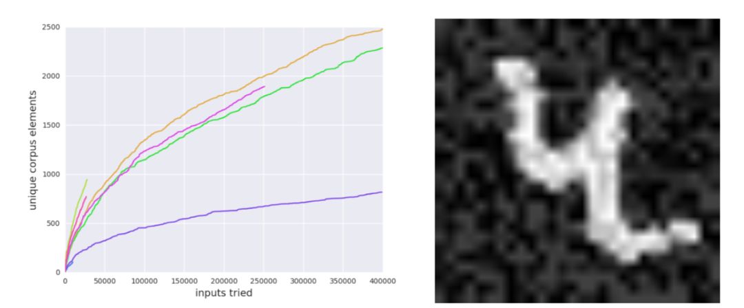 图三:研究者利用 32bit 浮点数训练 MNIST 分类器,再将与之相关的 TensorFlow 图截取为 16 位浮点数。原本的模型和截取后的在 MNIST 测试集的 10000 个元素上都做出了相同的预测。但 fuzzer 却能够发现他们之间的不同。左图:运行 10 次时模糊语料库的大小,一直向右延伸的线对应失败的 fuzzer 运行;右图:由 fuzzer 发现的图像,它被 32 位和 16 位神经网络分到了不同的类别。