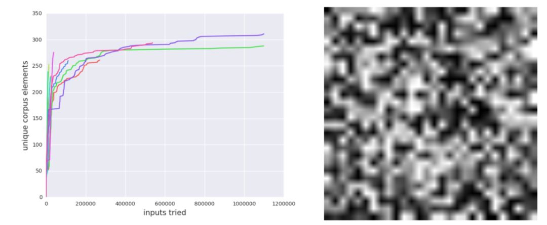 图二:研究者训练了一个 MNIST 手写数据集分类器,在训练过程中进行了一些不安全的数值操作。接下来研究者在其上运行了 10 次模糊测试器,每一次都发现了一个不符合限定的数据元素,而随机搜索则一个也没有发现。左图:运行 10 次时模糊语料库的大小;右图:模糊测试器发现的符合要求的图像。