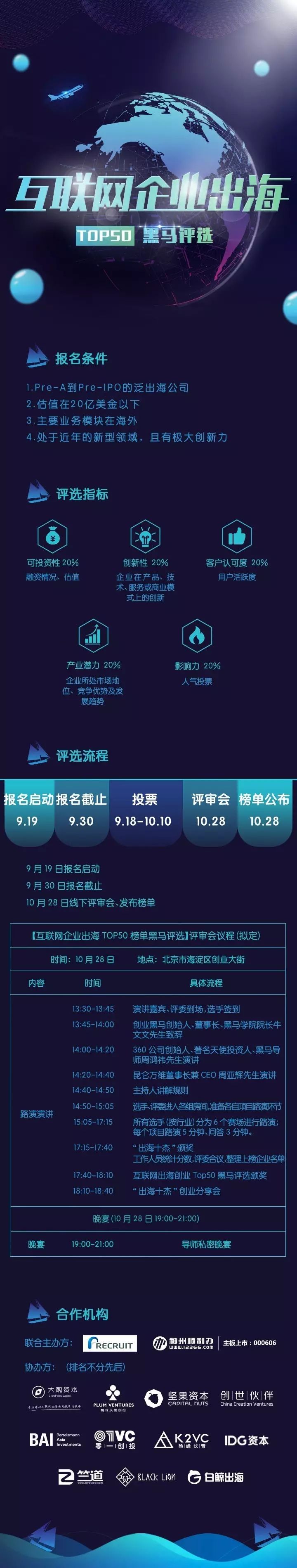 本次榜单,我们将邀请创世伙伴、梅花天使、坚果资本、零一资本、IDG资本、贝塔斯曼、顺为资本、君联资本、大观资本、启航创投等出海领域顶级创投机构,以及大龙网、茄子快传、APUS、触宝、WIF万能钥匙、昆仑万维、久邦、易点天下等出海领域标杆企业作为本次榜单评审团成员,从可投资性、创新性、客户认可度、发展潜力、行业影响力 5个角度进行打分,同时我们还启动了公众投票,票数加权转换成分数,两者相加评选出互联网企业出海50强榜单。