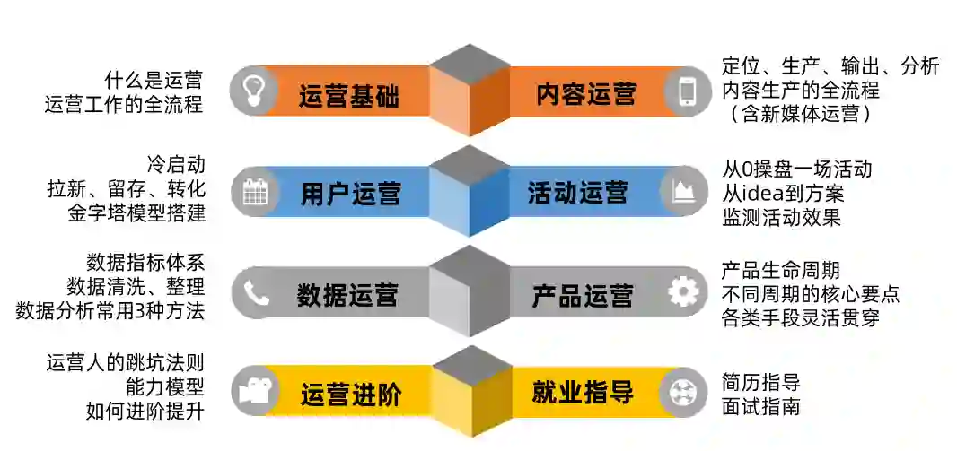 课程包含8大运营板块,能让你系统化学习运营知识,再根据【基础-提升-进阶-实操】4个流程稳固学习,听、学、演、练多位一体,达到培养系统化运营能力目的。