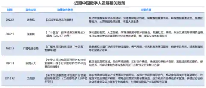 近年来,国家高度重视数字经济在推动产业结构优化升级、加快新旧动能转化中的重要作用,密集出台系列政策,引导数字经济的有序发展。作为数字经济的重要环节,数字人及其背后的支撑性技术同样得到政策多次覆盖。