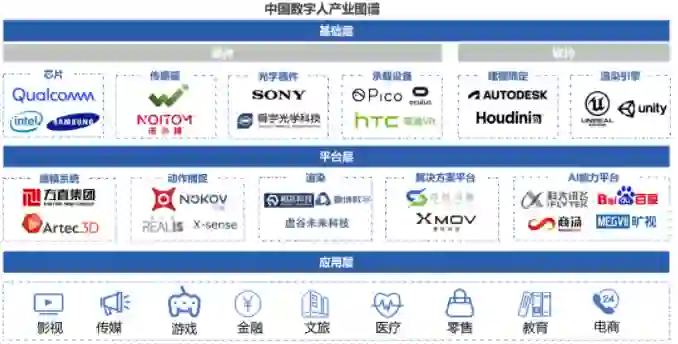 产业图谱:数字人产业图谱由基础层、平台层及应用层构成