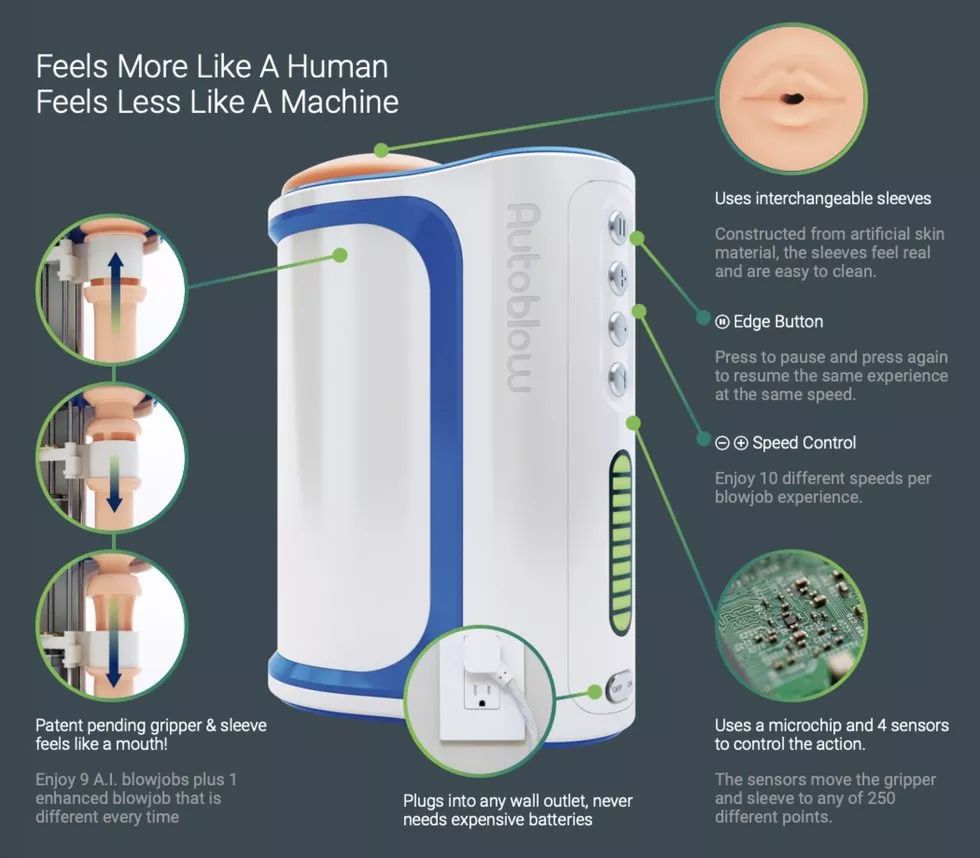 Autoblow AI 是该公司正在主推的新产品。基于机器学习技术,它能提供 10 种 oral sex (中文拼音简称“KJ”:) )体验模式。Sloan 介绍称,通过人工智能发现了 16 种基本 KJ 动作,他们还为此申请了相关专利。