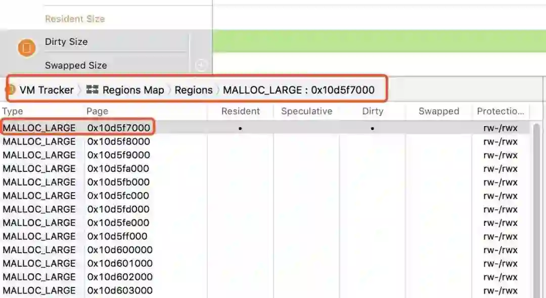 第一个地址是0x7faab2800000。我们切换到最底下的VM Track,将模式调整为Regions Map。