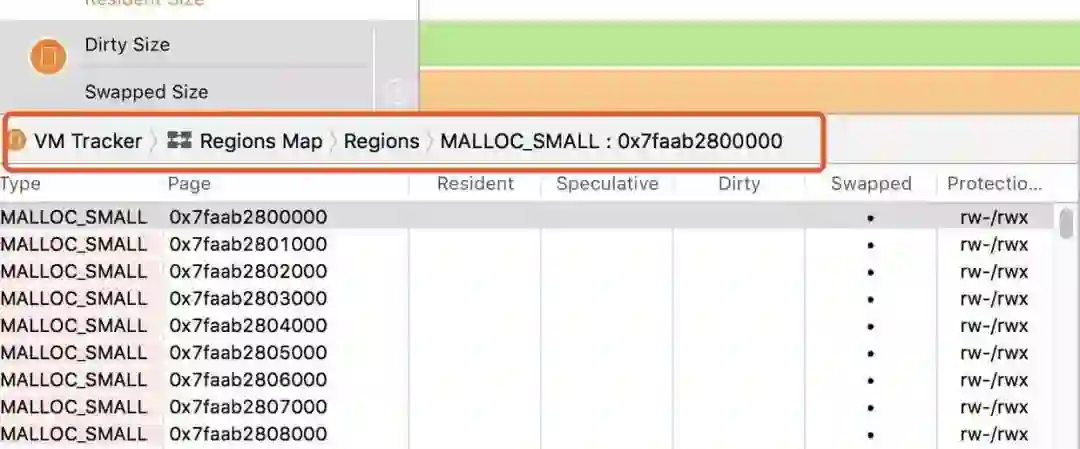 然后找到Address Range为0x7faab2800000开头的Region,我们发现这个Region的Type是MALLOC_SMALL。点击箭头看详情,你将会看到这个Region中的内存页列表。