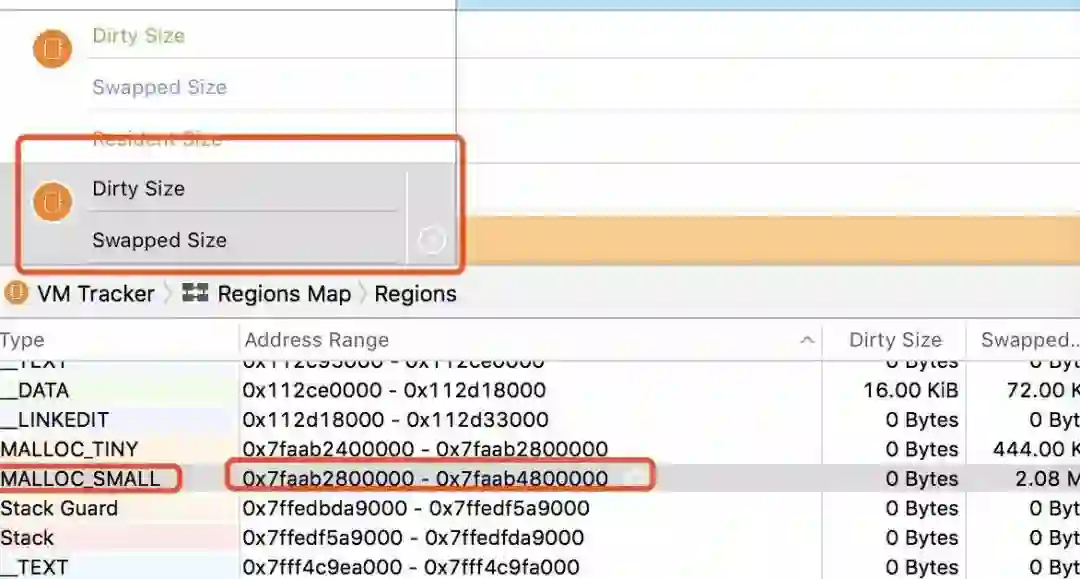 Virtual Size Virtual Size顾名思义,就是虚拟内存大小,将一个VM Region的结束地址减去起始地址就是这个值。Resident Size指的是实际使用物理内存的大小。Swapped Size则是交换到硬盘上的大小,仅OSX可用。Dirty Size根据官方的解释我的理解是如果一个内存页想要被复用,必须将内容写到硬盘上的话,这个内存页就是Dirty的。下面是官方对Dirty Size的解释。secondary storage可以理解为硬盘。