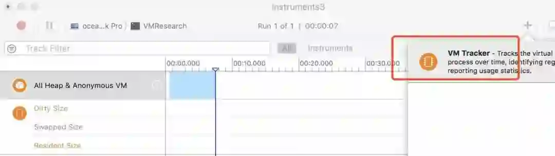 那么堆和VM Region是什么关系呢?按照前面的说法,应该任何内存分配都逃不过虚拟内存这套流程,堆应该也是一个VM Region才对。我们应该怎样才能知道堆和VM Region的关系呢?Instruments中有一个VM Track模版,可以帮助我们清楚的了解他们的关系。我创建了一个空的Command Line Tool App。