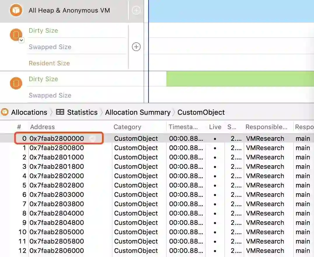 可能你已经发现了,截图中的内存页Swapped列下都是被标记的,因为我测试的是Mac上的App,所以当内存页不活跃时会被交换到硬盘上。这也就验证了我们在上面提到的交换机制。如果我们将CustomObject的尺寸变大,比如作如下变动。