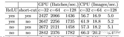 从表中第一行数据看出,当移除了ReLU和short-cut,大约提升了20%的速度。