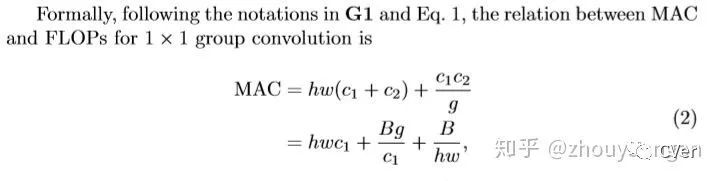 对于1x1的分组卷积(例如:MobileNetv2的深度可分离卷积采用了分组卷积),其MAC和FLOPS的关系为: