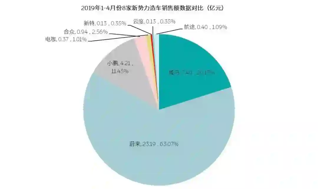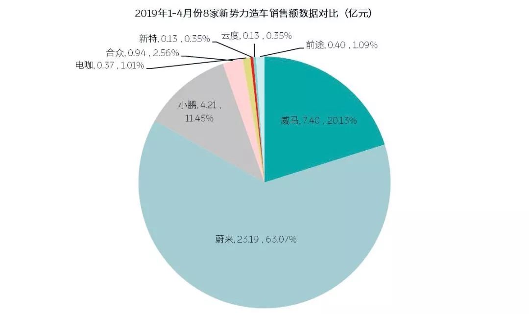走在前面的几家新造车企业,按照累计交付量(截至2019年4月的上牌数据)依次是蔚来(约1.6万辆)、威马(约9000辆)、小鹏(约5000辆),交付时间最早的蔚来占得先机;按照1~4月上牌量,是威马(约5300辆)、蔚来(约5100辆)、小鹏(约2800辆);按照1~4月销售额,单价更高的蔚来以23.2亿元,遥遥领先于之后的威马(7.4亿)和小鹏(4.2亿)。