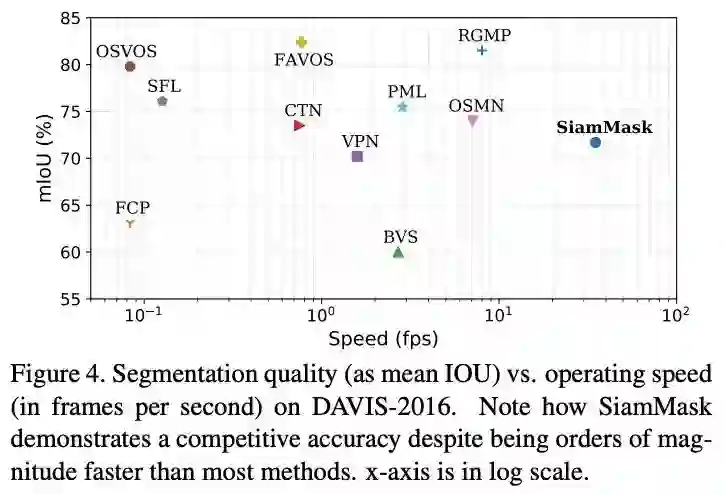 虽然SiamMask精度并不是最高的,但速度却比其他算法快1到2个数量级!在真实应用中更有价值。