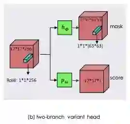 下图展示了其整天算法流程。左侧上面图像为框出来的目标图像,左侧下面图像为要搜索目标位置的视频中的一帧,经过卷积网络,生成Row(response of a candidate window,候选窗口响应),网络后面有三个head,除了在SiamFC法中已经存在的预测box(目标位置)的head和预测响应score(目标出现概率)的head,作者增加了预测目标mask(目标二值掩码)的head。