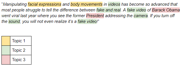 你可以从高亮的词语中总结出,这段话有三个主题(或概念)——主题1、主题2和主题3。一个良好的主题模型可以识别出相似的词语并将它们放在一组或一个主题下。上述示例中最主要的主题是主题2,表明这段文字主要关于虚假视频。