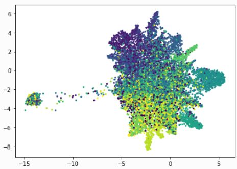 为了找出主题之间的不同,我们将其可视化。当然,我们无法可视化维度大于3的数据,但有一些诸如PCA和t-SNE等技术可以帮助我们将高维数据可视化为较低维度。在这里,我们将使用一种名为UMAP(Uniform Manifold Approximation and Projection)的相对较新的技术。