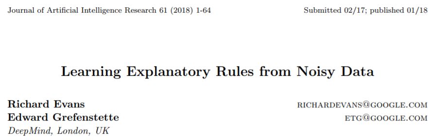 最近,DeepMind 在 JAIR 上发表论文《Learning Explanatory Rules from Noisy Data》,表明将直观感知思维和概念可解释性推理思维整合到单个系统中是可能的。他们介绍的系统∂ILP 对噪声数据具备鲁棒性,且可以高效地利用数据,并生成可解释的规则。