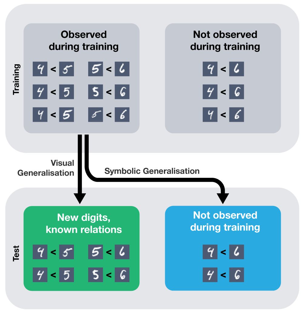 给标准的深度学习模型(如带 MLP 的卷积神经网络)提供足够的训练数据,它可以有效地解决这个任务。一旦网络经过了训练,你就可以向网络输入一对它未见过的图像,网络可以正确地对其分类。然而,只有用每对数字的多个样本进行训练,网络才能正确地泛化。这种模型的视觉泛化能力很好:泛化到新的图像上,假定它已经见过测试集中的所有数字对(参见下图中的绿框部分)。但它无法进行符号泛化:泛化到它从未见过的数字对(参见下图中的蓝框)。Gary Marcus 和 Joel Grus 近日通过发人深省的文章指出了这一点。
